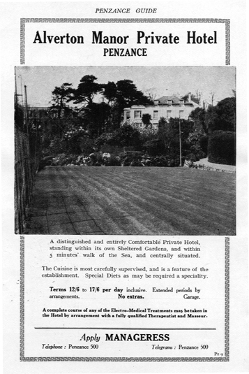 Alverton Vean was renamed Alverton Manor sometime after 1893, (that is to say that this is Alverton Manor in name only). Until recently the building was occupied by Walker Moyle Chartered Accountants. However, there has been redevelopment, with the main house now being turned over to residential units and an additional building being erected in the garden space for use by the accountants, and the new building, 'The Pavillion', is accessed from Trewithen Road.