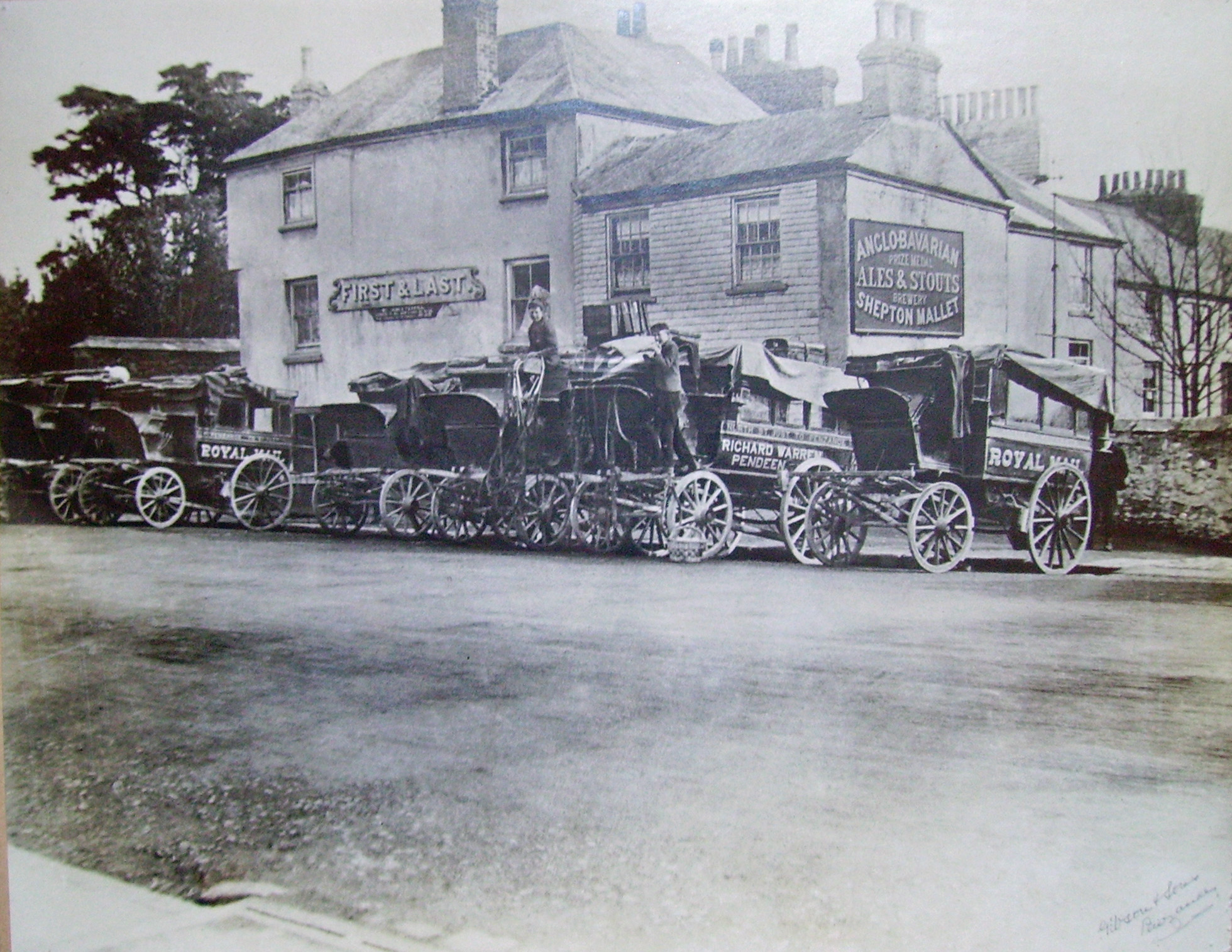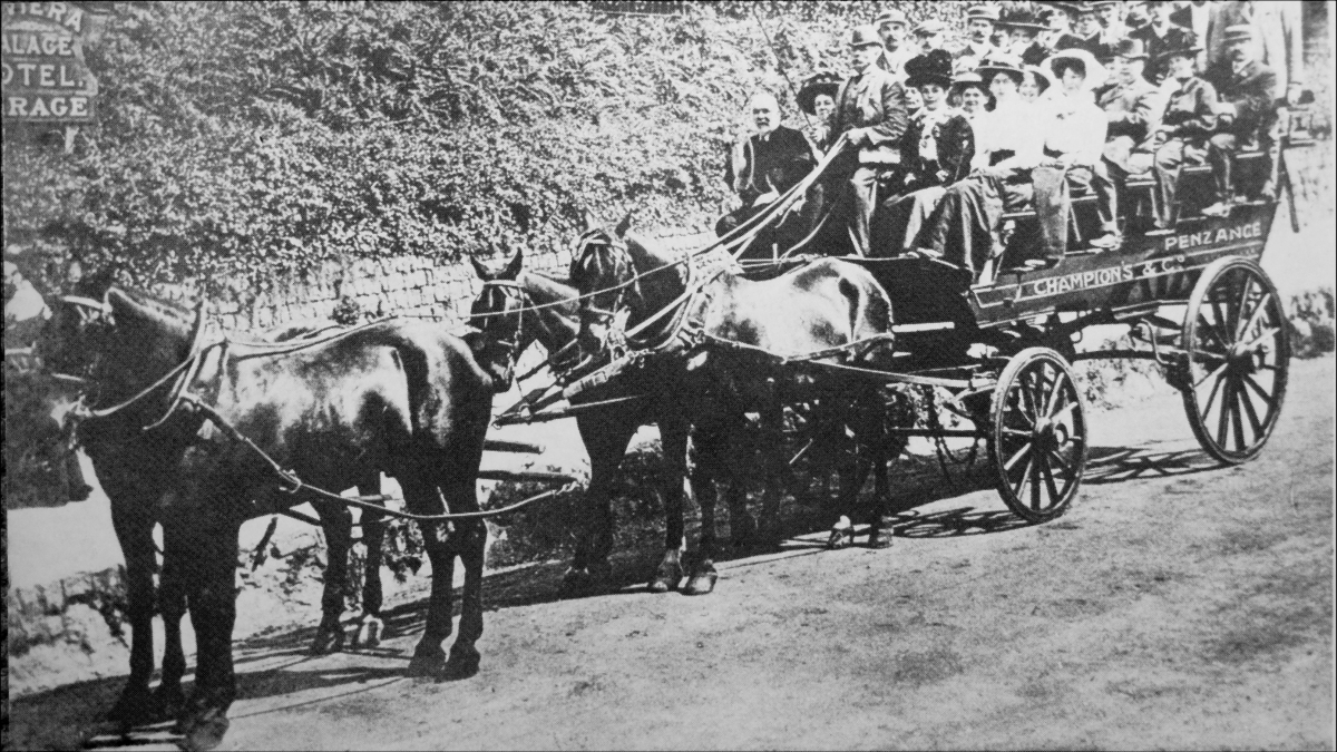 Penzance Antiqurian Society members sit in coach parked outside the First and Last Inn, Alverton Street, Penzance c1890
