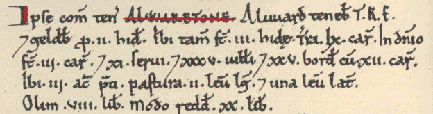 "The Count has manor which is called ALWARSTONE which Alward held T.R.E. (Tempora Regis Edwardi; in the time of King Edward the Confessor) Therein are 3 hides of land, and they rendered yeld for 2 hides. Sixty teams can plough these. Thereof the Count has in demesne half a hide and 3 ploughs and the villeins have 2½ hides and 12 ploughs. There the Count has 35 villeins and 2 bordars and 11 serfs and 1 rouncey and 17 unbroken mares and 9 beasts and 4 swine and 100 sheep and 3 acres of meadow and of pasture 2 leagues in length and in breadth. And it renders £20 yearly and when the Count received it, it was worth £8."