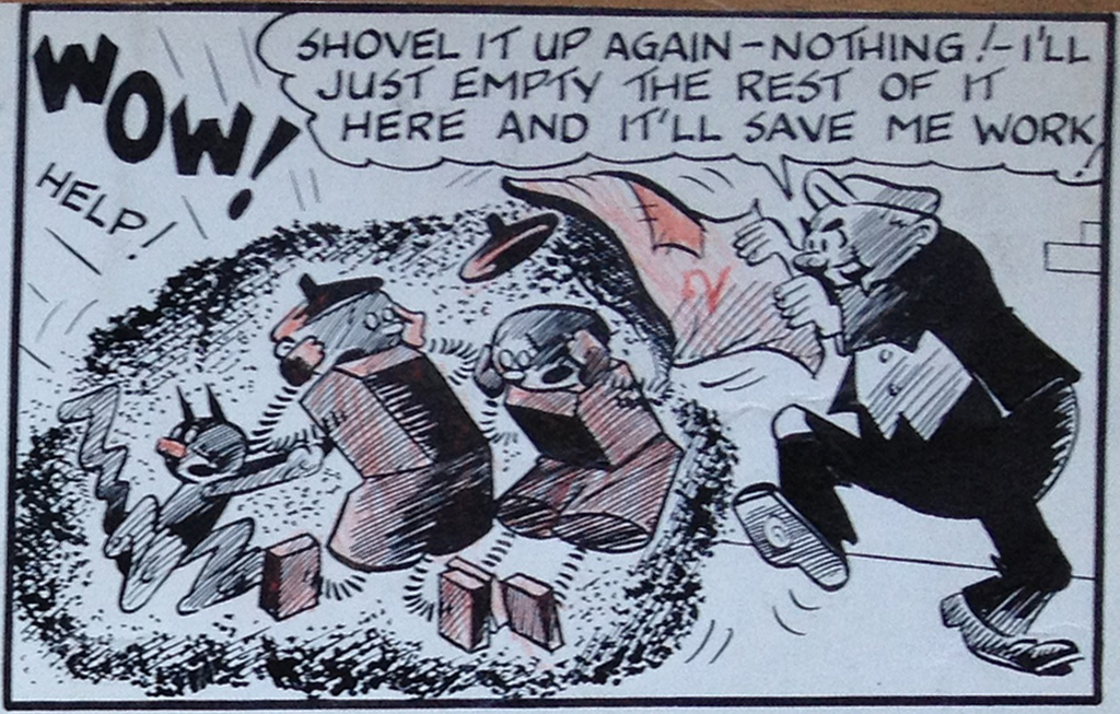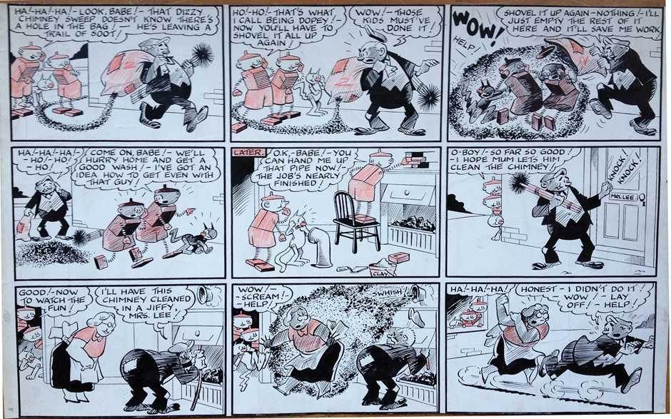 The 'Tin-Can Tommy' storyline, detailed in issue one of The Beano, suggested that Tommy the clockwork boy was built by his professor 'father' for wife, Mrs. Lee, as a substitute for the son they had lost the year before. In time Tommy was given a pal (Babe), and a mechanical cat (Clanky) and also even a horse made of metal (Ironsides). The Torelli brothers continued supplying fresh strips for many months, but with the advent of World War II hostilities erupted between Britain and Italy, and the Torelli Brothers migrated to France, so Thomson's were forced to source new artwork in Britain. From issue 69 of The Beano (18th November 1939) 'Tin-Can Tommy' was drawn by Sam Fair, who was followed in this work by two other staff artists, Charles 'Chick' Gordon and George Drysdale. 'Tin-Can Tommy' strips continued to appear in The Beano up to issue 303, in 1947.