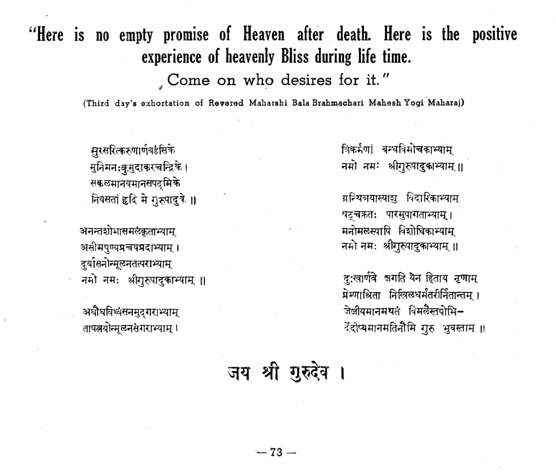 The last four lines of Sanskrit on page 43 later appear in the TM puja and directly refer to Guru Dev:
