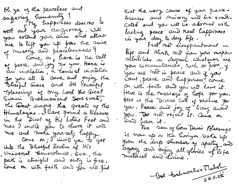Come on, here is the call of peace and joy for you. Here is an invitation, a cordial invitation for you all to come and enjoy the Blissful Grace and All Powerful Blessings of my Lord the Great Swami Brahmanand Saraswati, the Great among the greats of the Himalayas. I have found a treasure in the Dust of His Lotus Feet and now I invite you to share it with me and make yourself happy.